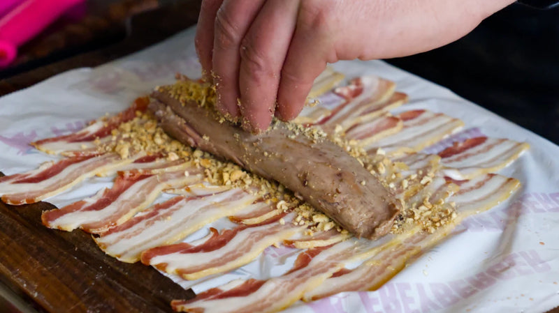 Für die Zubereitung eines Wildschweinfilets benötigst du pro Person 150 bis 180 Gramm Fleisch. Von dem Steak entfernst du zunächst die Silberhaut und schneidest es noch etwas zu. Danach brätst du es scharf mit ein wenig Olivenöl für etwa zwei Minuten von allen Seiten an. Zerstoße nun Haselnüsse mit einem Mörser. Bereite dir nun genügend Scheiben Speck zum umwickeln deines Steaks vor. Bestreiche den Speck mit Honig und füge deine gemahlenen Haselnüsse auf dem Speck und dem Steak hinzu. Umwickle abschließend dein Filet mit dem Speck.